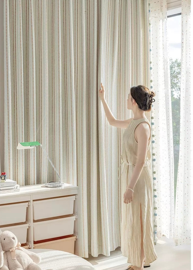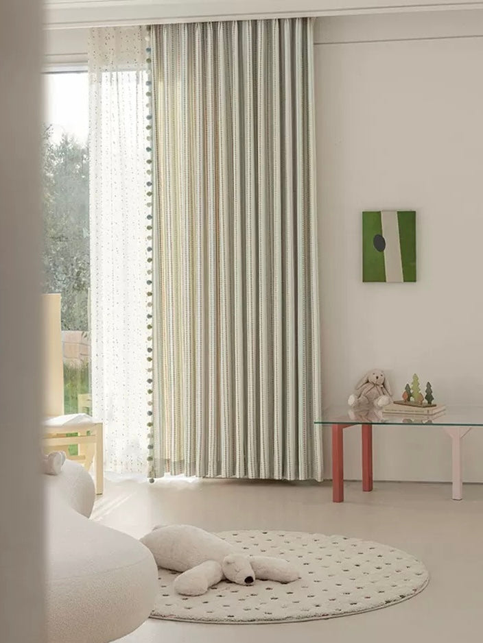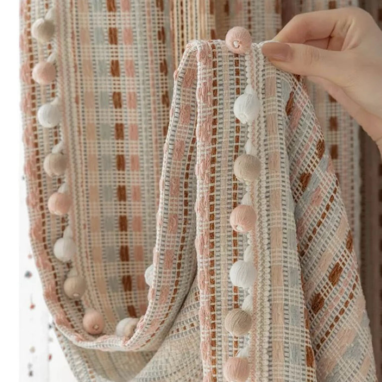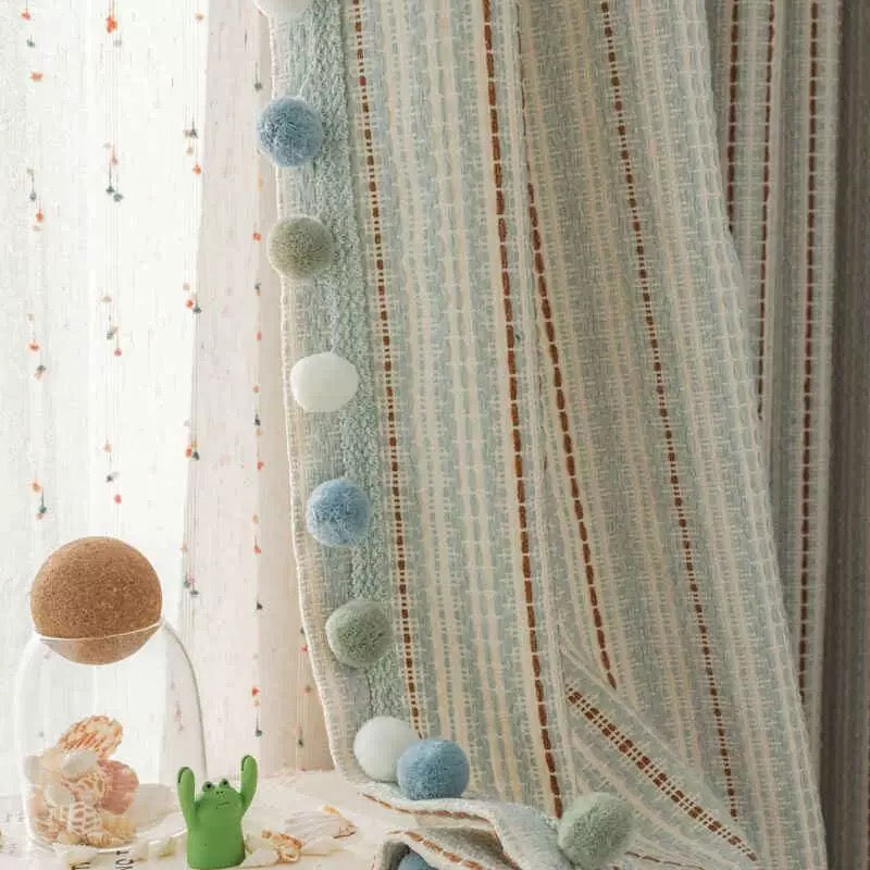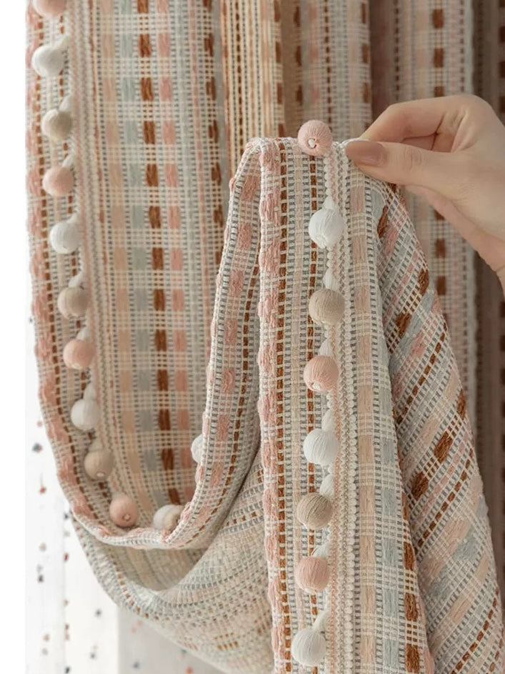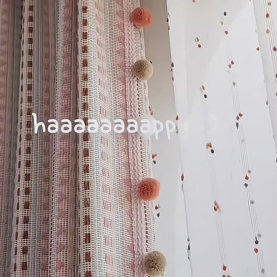 こちらのカーテンではサイズ・サイドのポンポン装飾オーダーが可能です。ご希望の 商品名+仕様を【Contact Us】フォームよりご連絡くださいませ。